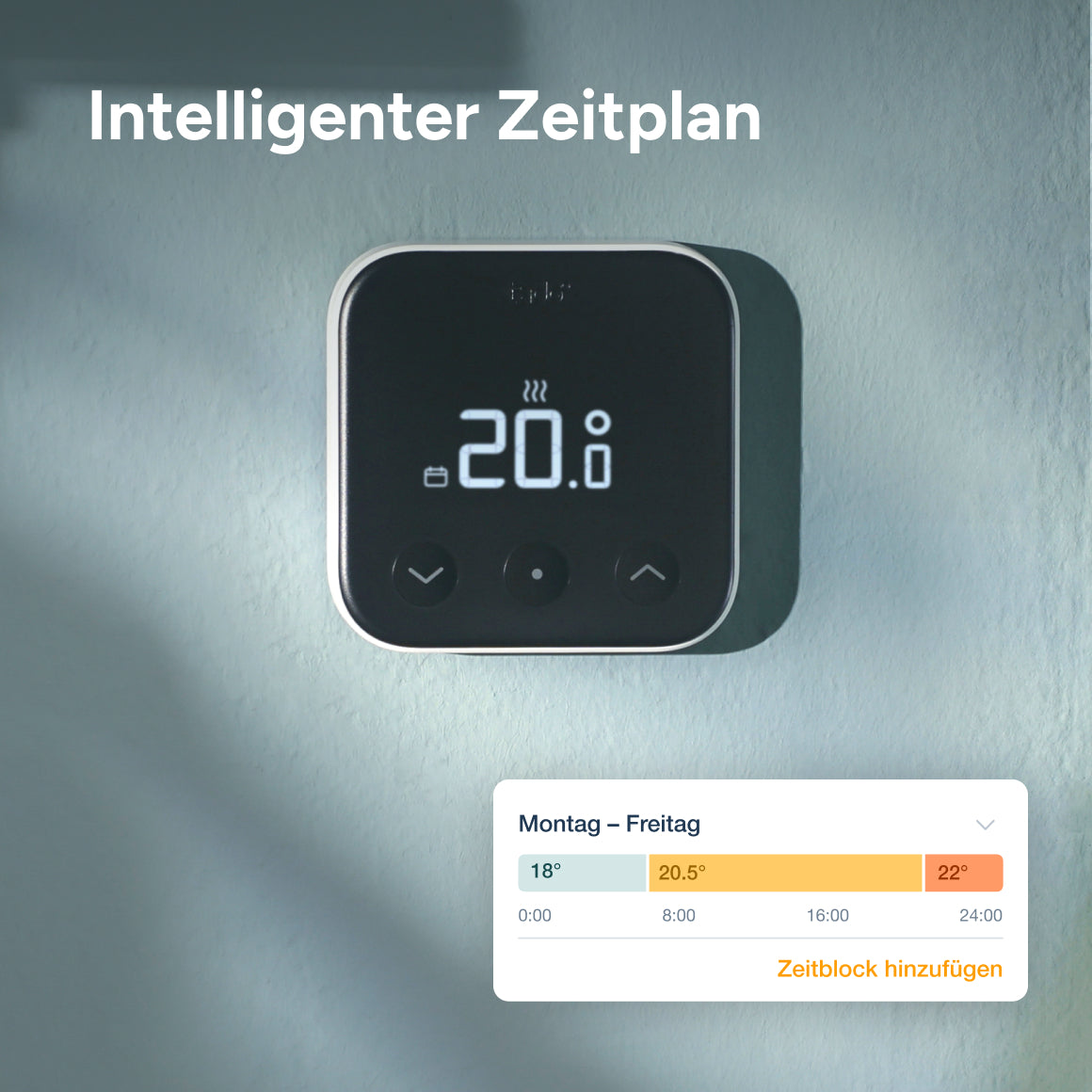Regle die Temperatur raumgenau von überall und erstelle mit wenigen Klicks individuelle Heizpläne. Besonders praktisch: Zeitpläne werden lokal im Gerät gespeichert und funktionieren auch ohne Internetverbindung. Am Gerät passt du Werte direkt über das intuitive Touch-Display an.