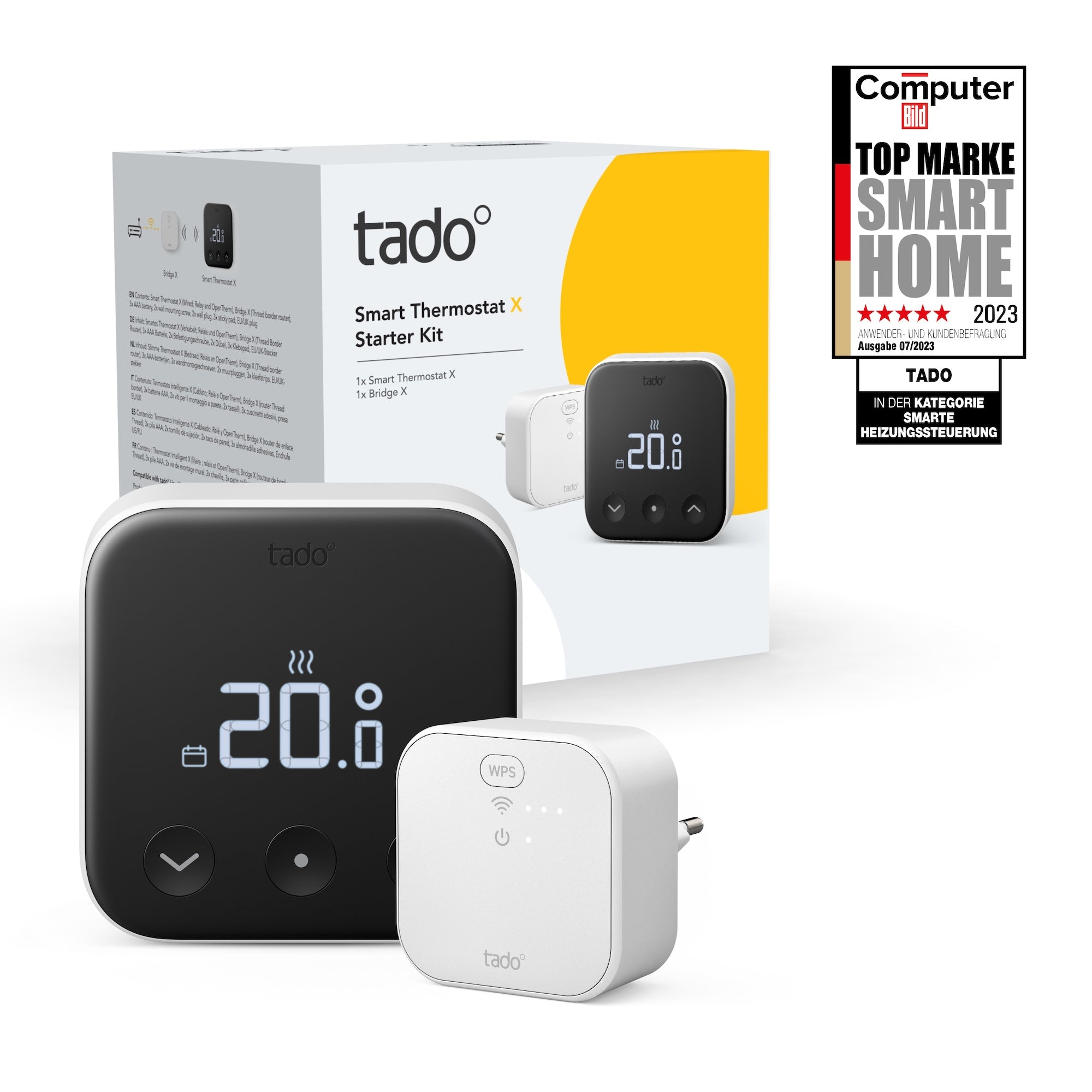 Die im Lieferumfang enthaltene Bridge X fungiert als Thread Border Router und bindet deine tado° X Geräte ins Internet ein. So steuerst du Räume zentral, erhältst schnelle Verbindungen und profitierst von geringer Latenz. Das Thermostat X unterstützt Relais und OpenTherm – für optimale Effizienz an modernen Heizthermen.